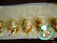 Описание: Пирожки из слоеного теста с фаршем, морковью, яйцами, консервированной кукурузой, сыром, зеленью петрушки.