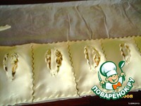 Сверху уложить второй слой, разрезать на пирожки, сделав в середине надрез. |