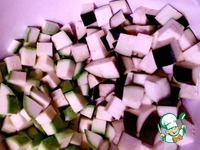 Нарезаем на кубики кабачок и баклажан. Примерно 1,5 на 1,5 см. Складываем их в глубокую посуду |