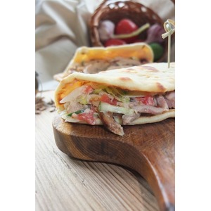 Сверху выкладываем курицу и поливаем соусом. Складываем лепешку пополам. Если это необходимо фиксируем зубочисткой. |