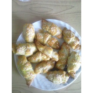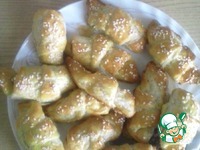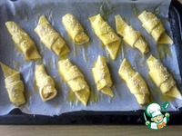 Даем тесту минут 10 полежать на столе. После чего раскатываем его толщиной 2-3 мм. Разрезаем его на треугольнички. |