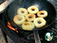 На мангал поставить решетку, на нее- чугунную сковороду. Растопить 1ст. л. сливочного масла и обжарить с двух сторон кружочки яблок, посыпав их 2 ст. л. сахара, до карамелизации. |