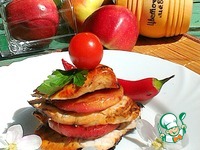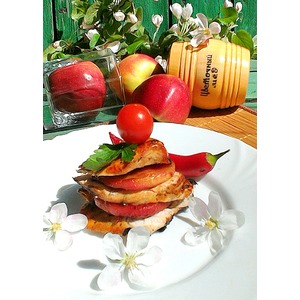 Грудку нарезать на тонкие ломтики, выложить горкой, чередуя с кружочками яблок, сверху полить образовавшимся клюквенно-яблочным соусом. Подать к столу. |