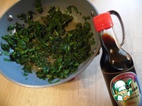Шпинат и зеленый лук нашинковать, обжарить на растительном масле 1-2 минуты, помешивая, добавить соевый соус, приправить перцем, тушить еще 3 минуты. |