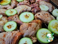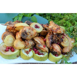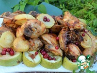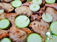 Кабачок вымыть, нарезать на шайбы, 2-2,5 см. Курицу выложить на решетку, разложить между кусками кабачок, луковицу также нарежьте на шайбы. |