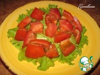 Овощи и зелень хорошо вымыть, просушить полотенцем. На порционную тарелку выложить слоями листья салата, затем нарезанный помидор. |