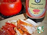 Аккуратно вычистить помидор от мякоти, оставив стенки 0,7 - 1 см. толщиной. Вяленые томаты очистить от кожицы, нарезать на полоски. Курицу также нарезать на полоски. |