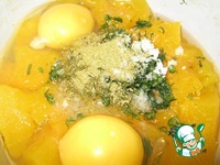 Теперь в остывшую тыкву добавляем 2 яйца, соль, сахар, зелень и щепотку хмели-сунели |