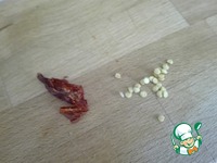 Берем половинку перца чили. У меня он сухой. Обязательно вычищаем его от семян и мелко режем. Добавляем его в нашу заправку. Даем пару минут еще проварится и выключаем. |