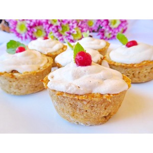 Выкладываем в корзиночку яблочную начинку, а сверху присыпаем пряником. Украшаем взбитыми сливками, по желанию можно добавить ягоды, мяту. |