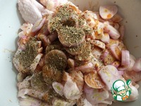 Добавьте лук, порезанный колечками и размятый руками. Сухой тархун и влейте соевый соус, посолите по вкусу. |