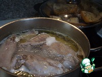 Затем вынуть крылья – они пригодятся для другого блюда. Сельдерей и репу очистить, порезать некрупным кубиком, со стороной сантиметра полтора-два. |