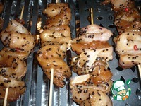 Разложить шпажки на противень-гриль "Forester". Разводим мангал, даём углям прогореть. Жарить куриные шашлычки на среднем огне до готовности, периодически переворачивая. |