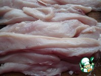 В приготовленный маринад положить нарезанные полоски куриного филе и поставить мариноваться на 30 минут. |