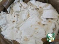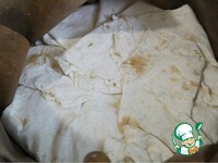 Выкладываем оставшуюся начинку и прикрываем другим листом лаваша приминаем его чтобы выровнять поверхность |