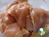 Куриное филе нарезать небольшими кусочками. Можно использовать как грудку, так и мясо бедрышек. |