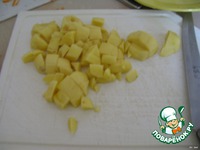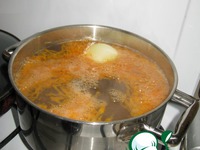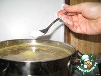 Чистим и режем кубиками картофель и добавляем в суп. Даем повариться минут 5. Потом прибавляем слегка огонь, чтобы закипело и затем опять убавляем огонь. |