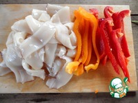 Нарезать кальмары на узкие полоски, 2 цвета болгарского перца нарезать на полоски. |