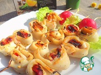 Скрутить рулеты из перца и обернуть их полосками кальмаров, нанизать на деревянные шпажки. |