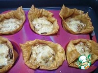 Далее листы заполняются жюльеном, который посыпается натертым сыром, после чего форма отправляется в разогретую до 180 градусов духовку до подрумянивания сыра. |