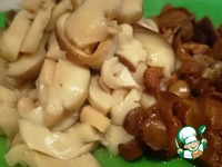 Для начала необходимо отварить грибы в кипящей подсоленной воде минут 10, затем из нарезать тонкими ломтиками. У меня белые и лисички. |