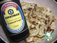 Добавить к луку грибы, влить необходимое количество соевого соуса. Я добавляю побольше, мне нравится чувствовать его вкус в готовом блюде. Далее все необходимо хорошо перемешать и потушить минут 5. |