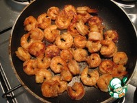 На сухой сковороде обжарить кунжут, переложить в тарелку. В этой же сковороде разогреть 2 ст. л. растительного масла, обжарить креветки, переложить на бумажное полотенце. |