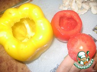 Перец почистить, как показано на картинке, у помидоров срезать шляпки, не до конца, убрать ложечкой мякоть. Наша посуда для заливного готова. |