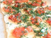 Слоеное тесто разморозить, раскатать, выложить на него замаринованную горбушу. Рыба получилась очень ароматной благодаря нашей приправе, не удержалась и съела несколько кусочков с хлебом! |