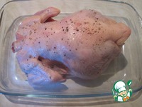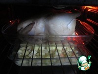 По истечении нужного времени тушку аккуратно перевернуть, стараясь не порвать кожу, и запекать еще 30-35 минут. |