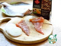 Икру просыпать специями с обеих сторон, лук порезать кольцами; |