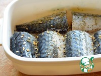 Противень смазать масло выложить кусочки рыбы и пропитать их мандариновой смесью; |