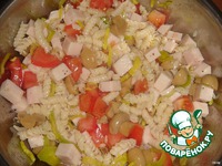 Добавить порезанные кубиками помидоры и мясо или ветчину. У меня - куриная ветчина. |