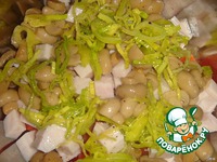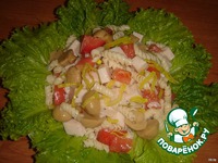 Маринованные грибы порезать на половинки или четвертинки, в зависимости от размера, и добавить к остальным ингредиентам. Замаринованный лук-порей вместе с маринадом добавить в салат. |