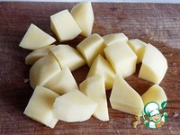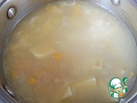 Когда лук стал мягким, добавляем к нему картофель и кукурузу, а так же 500 мл кипящей воды (или овощного бульона). Накрываем крышкой и варим минут 15- 20 (до готовности картофеля). |