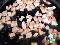 Пока варится суп, нарезаем бекон на небольшие кусочки и обжариваем до золотистого цвета. |