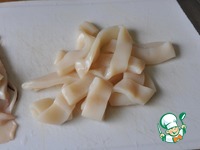 Берём кальмары, чистим, нам понадобятся тушки без "ушек". Обрезки варю обычно и делаю салат. Нарезаем очищенные тушки полосками (кольцами) шириной 2 см. |