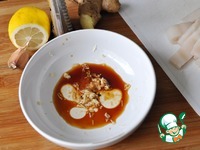 Готовим маринад. Натираем на тёрке корень имбиря, чеснок, добавляем сок лимона, сахар, соевый соус и оливковое масло. |