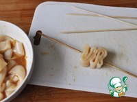 Берём деревянные палочки. Кольца кальмара складываем пополам, потом ещё раз пополам и нанизываем на палочки. |