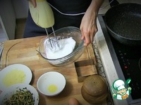 Отделить желток от белка у 1-го яйца. Белок взбить до мягких пик. |