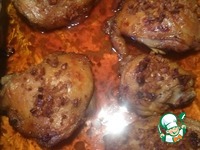 Разогреваем духовку до 200 градусов. Выкладываем курицу в форму. Накрываем фольгой. Ставим в духовку примерно на час. Затем снимаем фольгу и держим несколько минут до румяной корочки. |