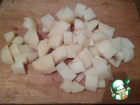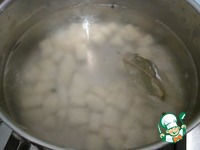 Тем временем вода в кастрюле закипела. Положить картофель в воду, добавить соль, перец, лавровый лист. Варить минут 5 после закипания, до полуготовности картошки. |