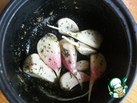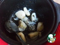 Положить чеснок и залить все это маслом. Я брала домашнее, пахучее. Закрываем крышкой горшочек и отправляем в духовку на 20 минут при температуре 150-170* |