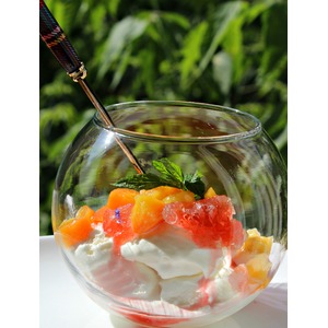 Выкладываем в чашу мороженое, граните и сверху персики. Украсила мятой. |