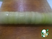 Огурец очистить Порезать на тонкие полосочки повдоль (не использовать часть с семенами) Выложить полосочки внахлест (потом я уже догадалась, что лучше подложить бамбуковый коврик или пленку) |