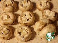 Начинить грибы сырной начинкой и сколоть зубочистками по две шляпки, как показано на фото. |