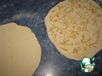Вторую часть теста поделить пополам и раскатать. На одну выложить лук, накрыть второй частью теста. |