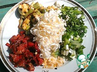 Готовые овощи мелко порезать, добавить измельченные зелень, лук, чеснок, сыр, перемешать. |