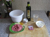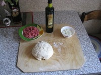 Подготовленные продукты: Просеянная мука, мелко порезанный лук, дрожжи, вода, соль, фарш ( у меня говяжий). |