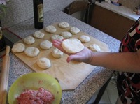 Произвольно режем на кружочки. В серединке пальчиками делаем углубление, это для того, чтобы не выпал фарш. |
